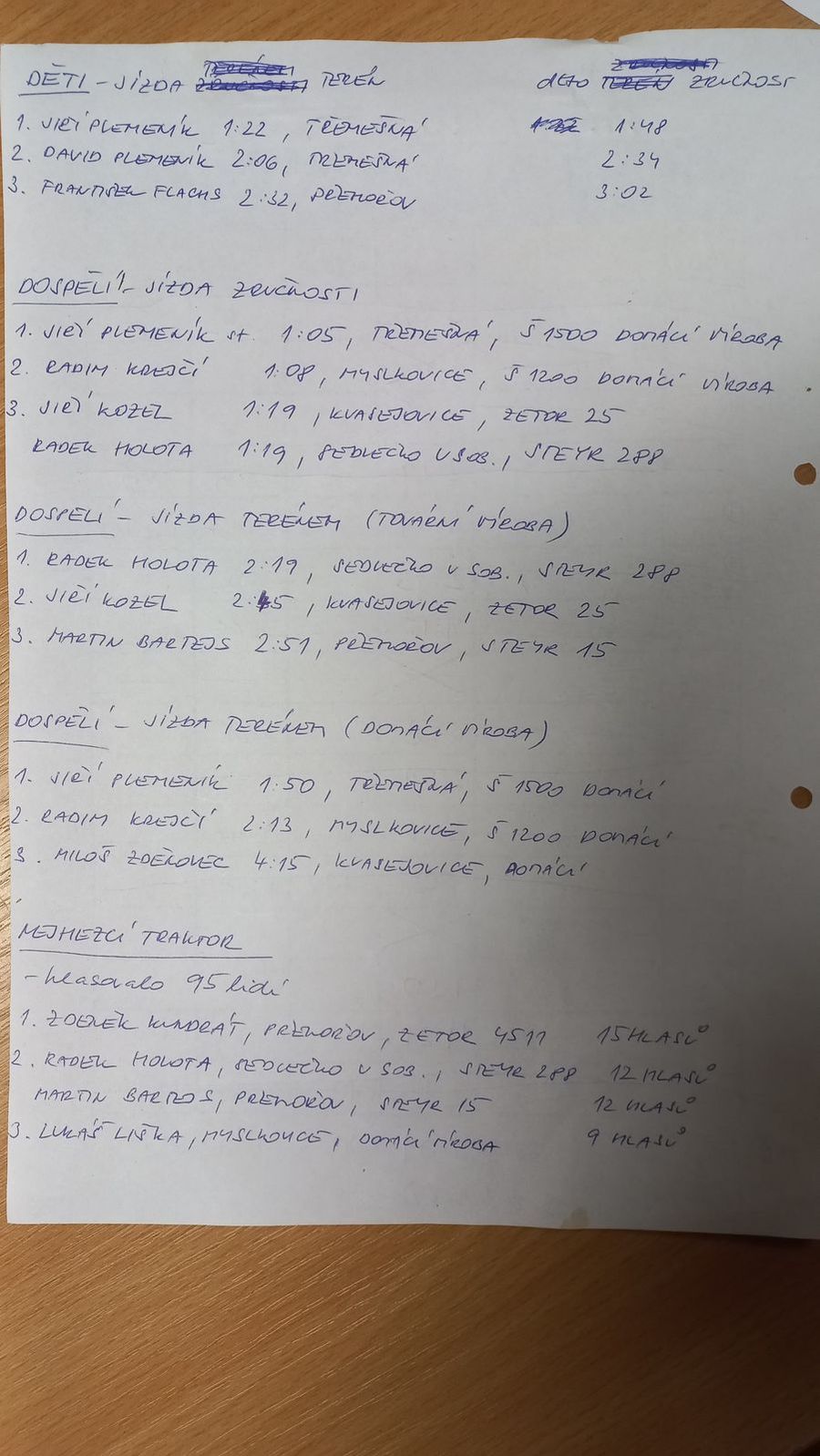 Původně zrušený termín traktoriády (14. 9.) jsme přeložili na dnešní sobotu. Původně avizované pěkné počasí se pár dnů před zhoršilo a tak bylo zataženo s přeháňkami. I přes to k nám letos dorazilo celkem 36 traktorů, z nichž téměř všichni jeli spanilou jízdu skrze vsi. I v jízdě zručnosti bylo opravdu hodně přihlášených. Nejlépe se podařila Jiřímu Plemeníkovi z Tremešné se svým traktorem domácí výroby s motorem Škoda 1500. Druhý byl Radim Krejčí z Myslkovic, rovněž s domácím traktorem s motorem Škoda 1200. O třetí místo se podělil domácí Jiří Kozel (Zetor 25) s Radkem Holotou ze Sedlečka (Steyr 288). Letos poprvé jeli tento závod i registrované děti na traktorových miniaturách. Vítězem se stal Jiří Plemeník ml., před svým bratrem Davidem. Oba z Třemešné. Třetí byl František Flachs z Přehořova. Následovala oblíbená jízda terénem. Tady v kategorii stroje tovární výroby zvítězil Radek Holota (Steyr 288). Druhý byl Jiří Kozel (Zetor 25) a třetí Martin Bartejs (Steyr 15). Ve strojích domácí výroby zvítězil Jiří Plemeník, druhý byl Radim Krejčí a třetí Miloš Zděnovec. Trať bez vodního příkopu si projely i děti a skončily stejně jako v jízdě zručnosti. Při vyhlašování výsledků byl vyhlášen také nejlepší/nejhezčí traktor. Hlasovalo celkem 95 lidí a vítězem se stal traktor s č.1 Zetor 4511 Zdeňka Kundráta. Ze všech hlasujících byl pak vylosován Zdeněk Zahradník, který si odnesl poukaz na 4000,- Kč do táborského obchodu B+J. I přes nepřízeň počasí to byl nakonec moc vydařený den a 4. ročník se i přes řadu problému nakonec vyvedl.