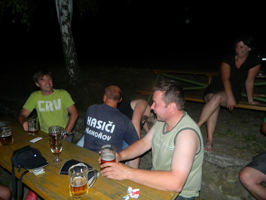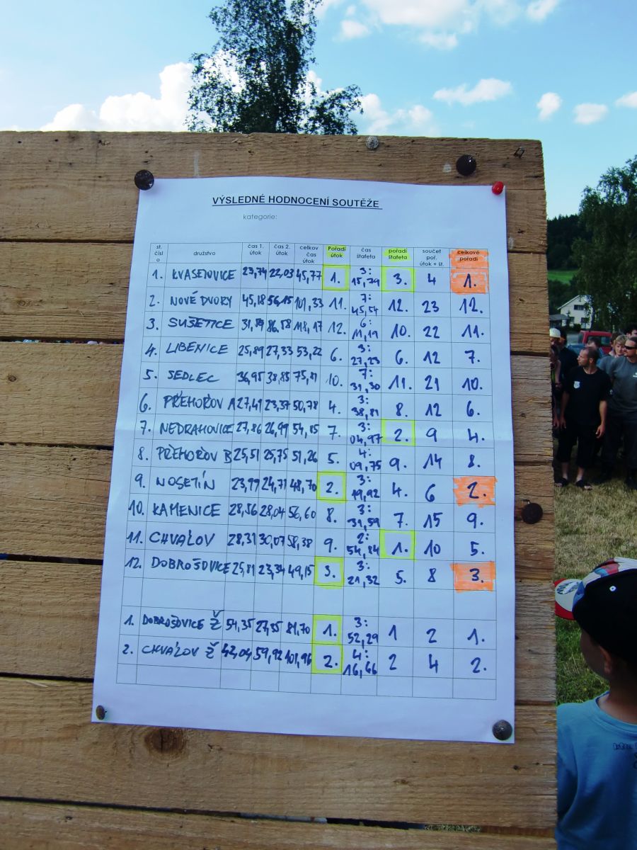 Po roce se opět konal v partnerských Kvasejovicích Chobot-cup na kterém jsme samosebou nemohli chybět. Tradiční cyklovýprava vyjela již v pátek dopoledne a po sérii zastávek dorazila v podvečer na místo. Po vřelém přivítání se prodiskutovalo vše nové co se událo za posledné měsíce. Sobotní dopoledne pak dorazil zbytek sboru a šlo se na věc. Letos se kvůli podmáčenému terénu běhalo po rovině pod nádrží. Každé družstvo šlo dva útoky na 2B, z kterých se oba časy sečetly. Následovala hasičská štafeta. Pořadí z obou disciplín se sečetlo a dalo tak výslednou tabulku. Družstvu A se nepovedl první útok (27,41s), který následně v druhém pokuse vylepšilo na 23,37s. Součet 50,78s znamenal po požárních útocích průběžné 4. místo. Družstvo B podalo téměř vyrovnané výkony a s časy 25,51s a 25,75s po součtu 51,26s obsadilo průběžné 5. místo. Celkem dobrou výchozí pozici mohly vylepšit štafety. Ta se ale nepovedla na jedničku ani jednomu z družstev A: 8. místo s časem 3:38,81s a B: 9. místo s časem 4:09,75s. Součet pořadí nakonec posunul obě družstva níže a družstvo A skončilo na 6. místě, družstvo B na 8. místě z celkových dvanácti týmů. Hasičský křest nováčka si tentokrát vychutnal Richard Mendl. Místo kádě posloužila hasičská nádrž. Až na výjimky v ní nakonec (jak je zvykem) skončili z našich družstev skoro všichni. U našich kamarádů to byla jako vždy moc pěkná soutěž. Výjimkou se letos stalo snad jen to, že jsme tentokráte odjeli všichni domů „už“ v sobotu.