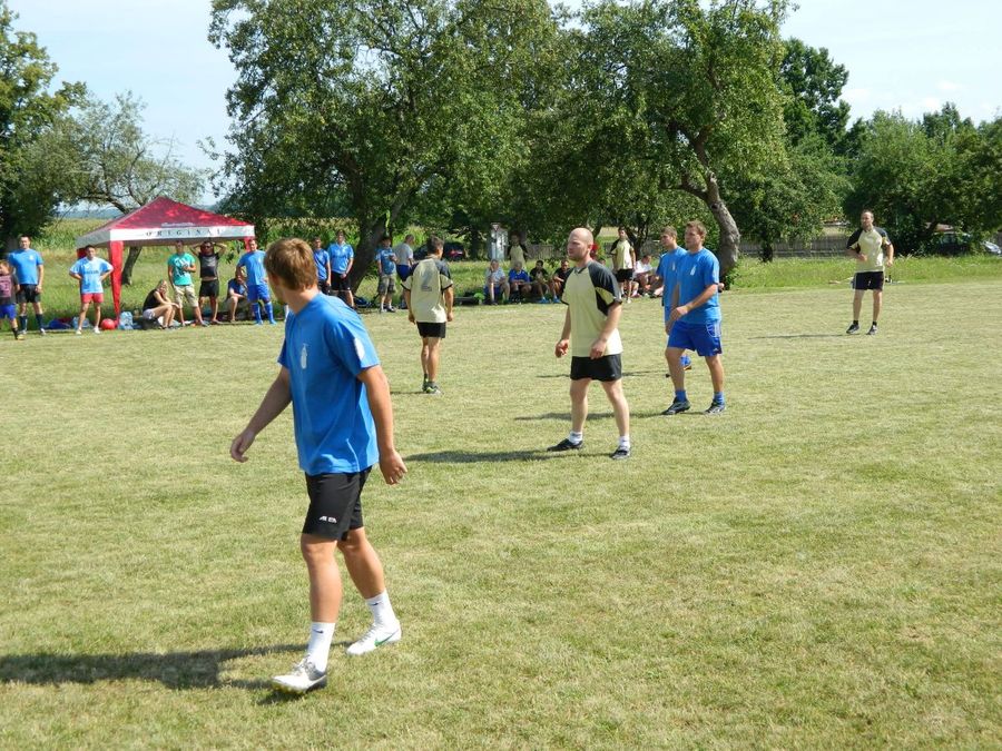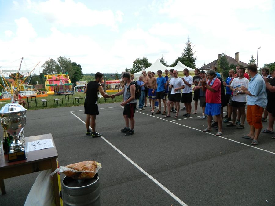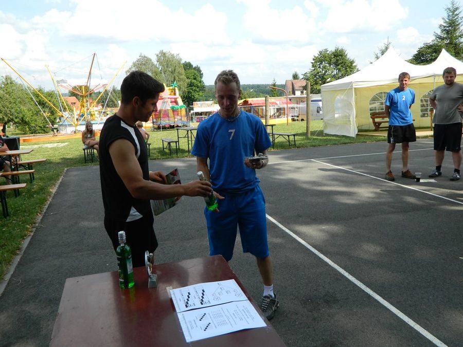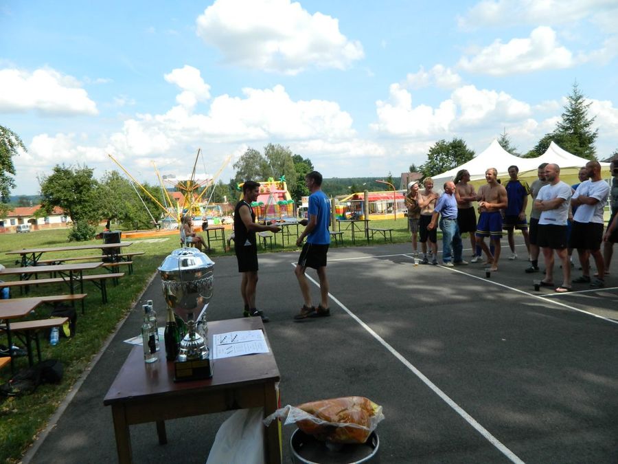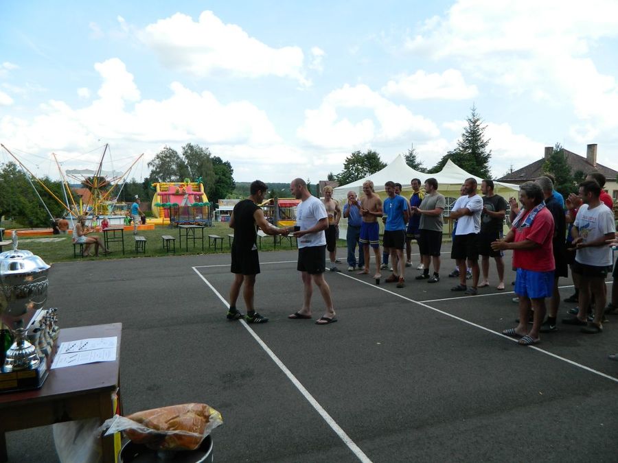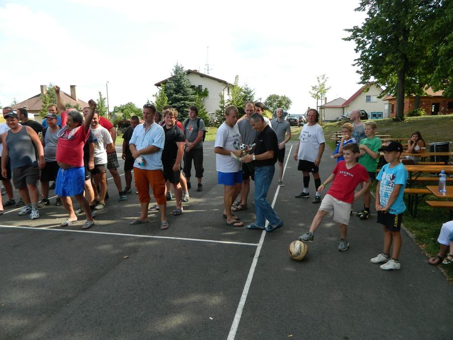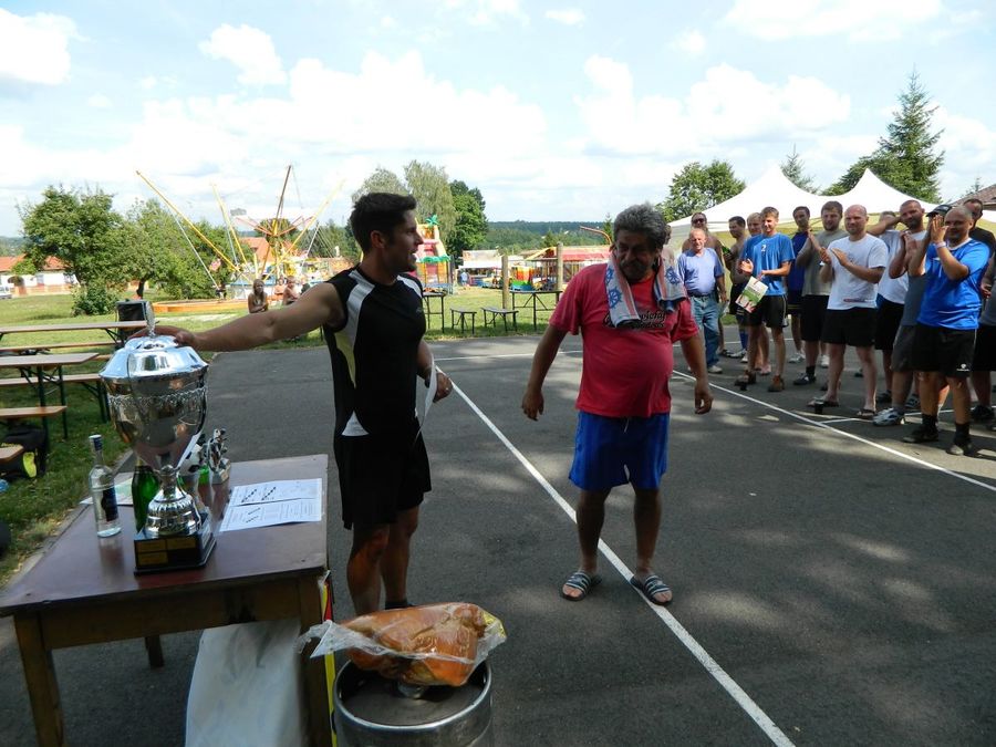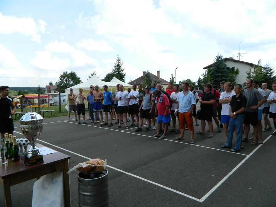 V sobotu 26.7. ráno začal Svatoannenský fotbalový turnaj s tradičními účastníky. Po třech výhrách postoupil ze skupiny A do semifinále jasně loňský vítěz z Mezné. Dvě výhry posunuly dále také tým domácích starších pánů. S jednou výhrou nepostoupily Klenovice a bez bodu ani Soběslav. Ze skupiny B prošly dále s dvěma výhrami a jednou remízou Košice a Vlastiboř s dvěma výhrami taktéž. Jedna výhra a jedna remíza nestačila na postup favorizovanému družstvu z Chlebova a bohužel ani náš domácí tým mladších se dále nedostal, jelikož tentokrát nevyhrál ani jedno utkání ve skupině. První semifinále těsně vyhrálo družstvo z Mezné 2:1 proti Vlastiboři a stejně jako loni se dostalo do finále. Druhé semifinále bylo napínavé především pro domácí fanoušky. Tam se totiž povedlo zvítězit domácímu družstvu starších rozdílem 2:1 a dostat se přes Košice až do finále. Zápas o 3. místo měl od počátku jistého vítěze, kterým se stalo po výhře 3:1 družstvo Košic. Napínavé finále bylo prosté na góly. Padl jen jeden, avšak ten nejdůležitější - šťastnější pro naše hráče. Stav 1:0 pro naše vydržel až do závěrečného hvizdu a domácí tým starších pánů se stal vítězem letošního ročníku a zároveň poprvé v historii. Pochvalu za výborné výkony zaslouží i téměř bezchybný tým z Mezné, který prohrál jediný zápas a to až ve finále. Pořadí turnaje bylo tak následující: 1. Domácí tým starších 2. Mezná 3. Košice 4. Vlastiboř 5. Chlebov 6. Klenovice 7. Domácí tým mladších 8. Soběslav. Pohár pro nejlepšího hráče turnaje obdržel Michal Vrba z Vlastiboře. Nejlepším golmanem se stal Luboš Novák chytající po několikáté za tým domácích. Pochvalu zaslouží i rozhodčí, kterým se tentokráte stal jindy hrající Jindra Vejvar. Za nejlepšího hráče domácích byl po hlasování zvolen Ján Lapšanský, u kterého byl zohledněn nejen jeho výkon, nasazení ale i věk. Z rukou mezenských fotbalistů a Ladislava Hanzala (před lety zasponzoroval pohár) tak naši převzali putovní pohár, sud piva, 18ti kg kýtu, šampaňské a lahev kořalky. Foto: