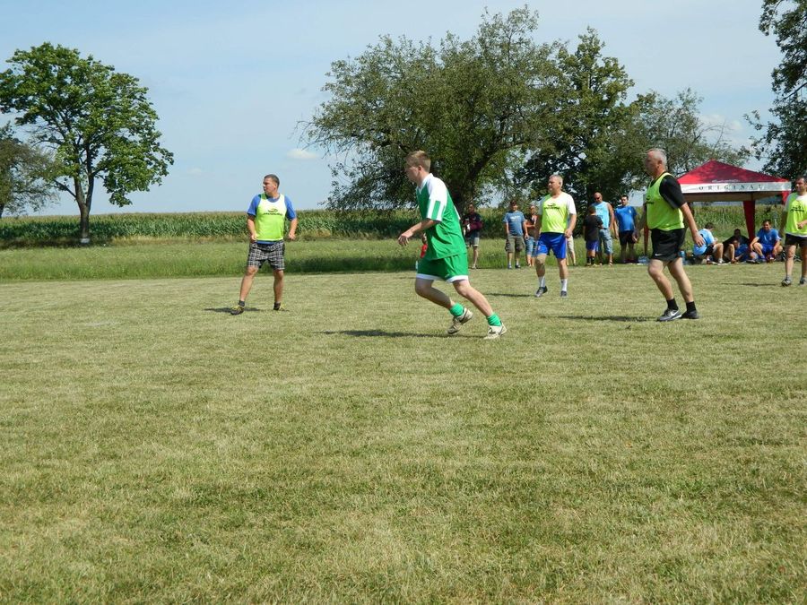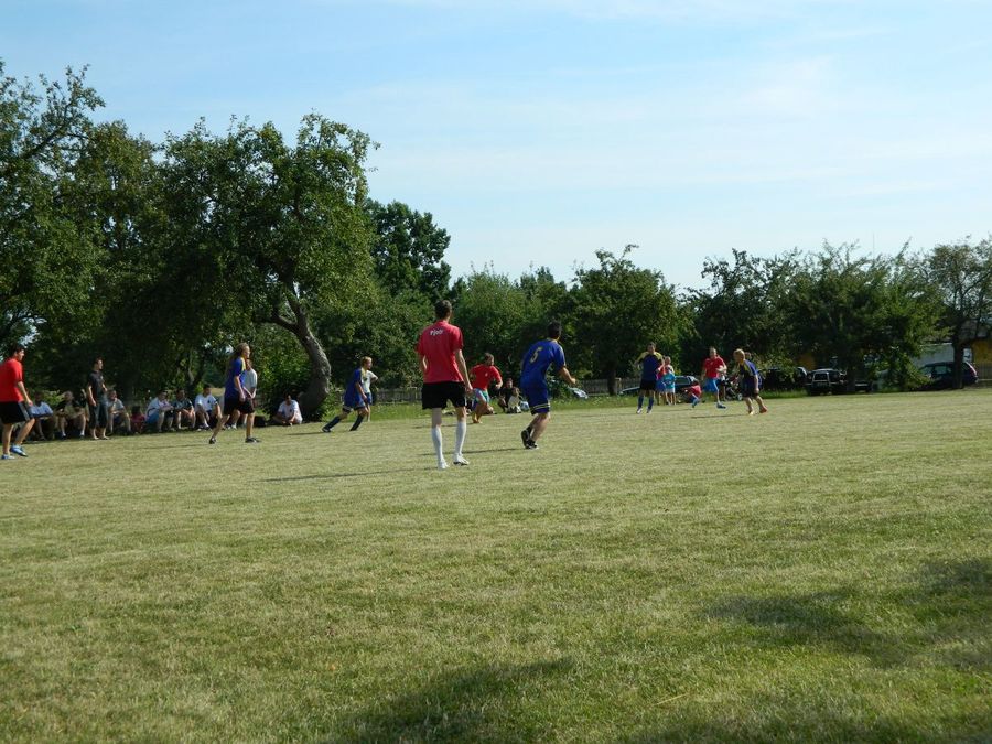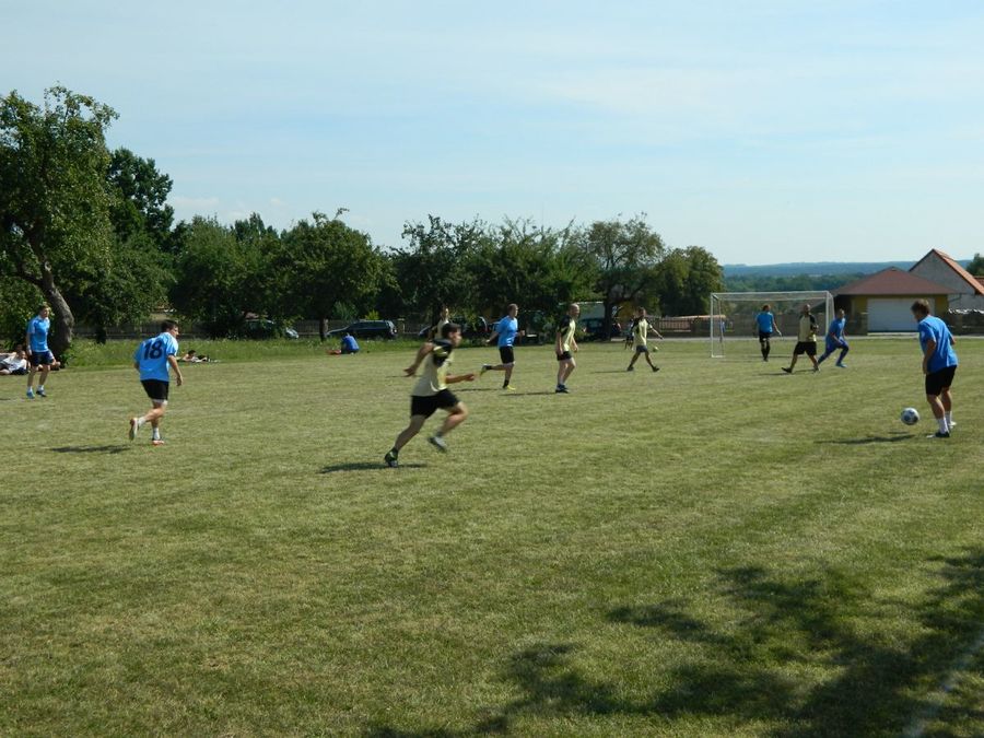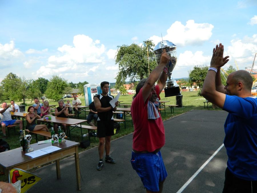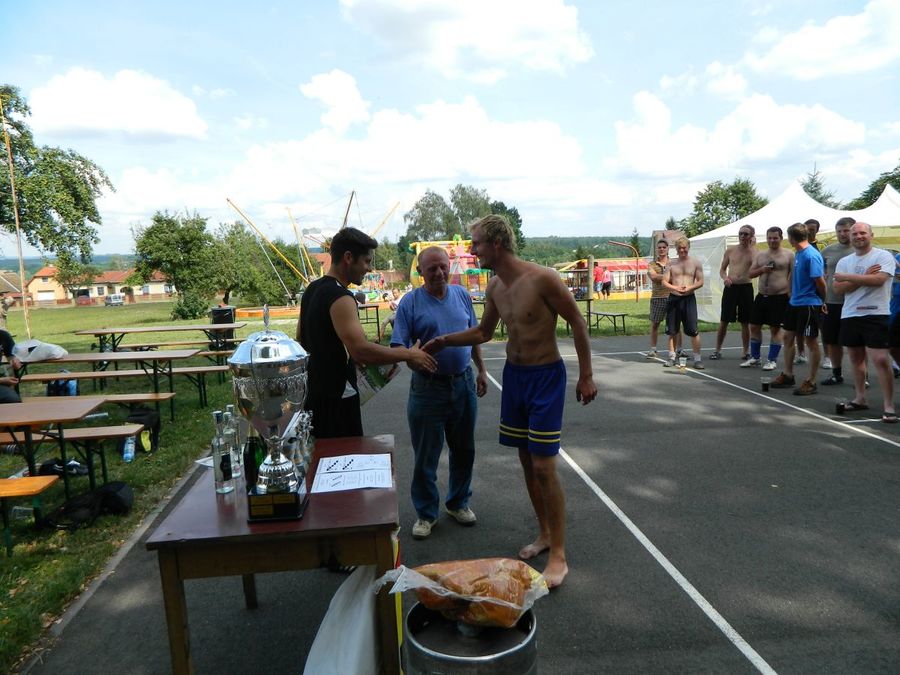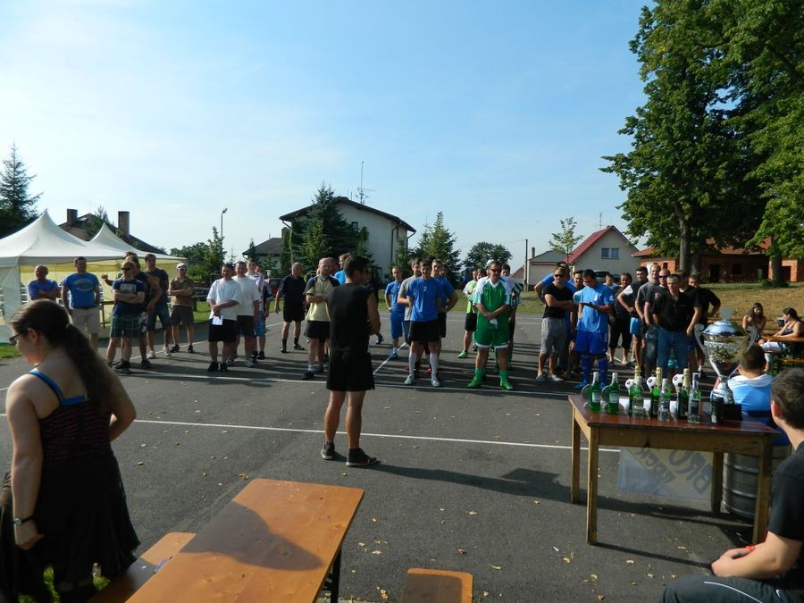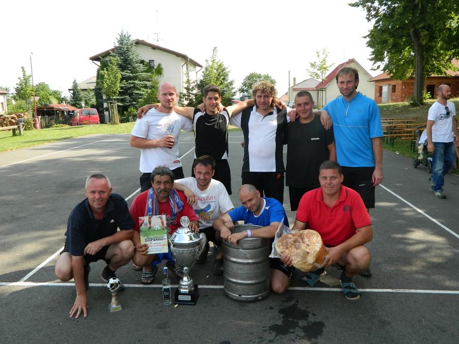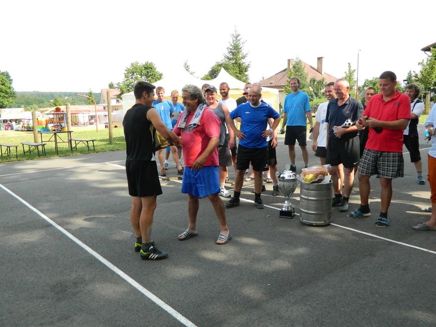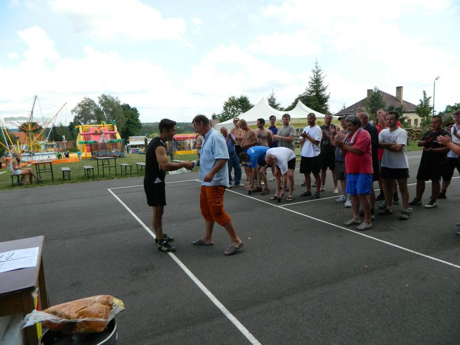 V sobotu 26.7. ráno začal Svatoannenský fotbalový turnaj s tradičními účastníky. Po třech výhrách postoupil ze skupiny A do semifinále jasně loňský vítěz z Mezné. Dvě výhry posunuly dále také tým domácích starších pánů. S jednou výhrou nepostoupily Klenovice a bez bodu ani Soběslav. Ze skupiny B prošly dále s dvěma výhrami a jednou remízou Košice a Vlastiboř s dvěma výhrami taktéž. Jedna výhra a jedna remíza nestačila na postup favorizovanému družstvu z Chlebova a bohužel ani náš domácí tým mladších se dále nedostal, jelikož tentokrát nevyhrál ani jedno utkání ve skupině. První semifinále těsně vyhrálo družstvo z Mezné 2:1 proti Vlastiboři a stejně jako loni se dostalo do finále. Druhé semifinále bylo napínavé především pro domácí fanoušky. Tam se totiž povedlo zvítězit domácímu družstvu starších rozdílem 2:1 a dostat se přes Košice až do finále. Zápas o 3. místo měl od počátku jistého vítěze, kterým se stalo po výhře 3:1 družstvo Košic. Napínavé finále bylo prosté na góly. Padl jen jeden, avšak ten nejdůležitější - šťastnější pro naše hráče. Stav 1:0 pro naše vydržel až do závěrečného hvizdu a domácí tým starších pánů se stal vítězem letošního ročníku a zároveň poprvé v historii. Pochvalu za výborné výkony zaslouží i téměř bezchybný tým z Mezné, který prohrál jediný zápas a to až ve finále. Pořadí turnaje bylo tak následující: 1. Domácí tým starších 2. Mezná 3. Košice 4. Vlastiboř 5. Chlebov 6. Klenovice 7. Domácí tým mladších 8. Soběslav. Pohár pro nejlepšího hráče turnaje obdržel Michal Vrba z Vlastiboře. Nejlepším golmanem se stal Luboš Novák chytající po několikáté za tým domácích. Pochvalu zaslouží i rozhodčí, kterým se tentokráte stal jindy hrající Jindra Vejvar. Za nejlepšího hráče domácích byl po hlasování zvolen Ján Lapšanský, u kterého byl zohledněn nejen jeho výkon, nasazení ale i věk. Z rukou mezenských fotbalistů a Ladislava Hanzala (před lety zasponzoroval pohár) tak naši převzali putovní pohár, sud piva, 18ti kg kýtu, šampaňské a lahev kořalky. Foto: