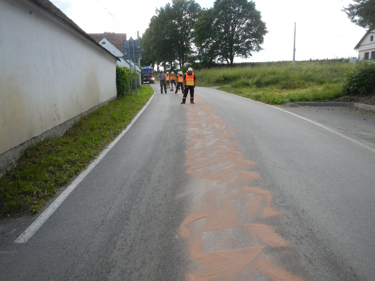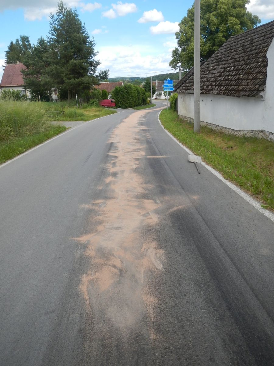 Naše jednotka byla odpoledne vyslána do obce Kvasejovice k úklidu motorové nafty. Po příjezdu na místo zasahovala na místě již jednotka HZS PS Soběslav. Společně s HZS jsme provedli zasypání sorbentem cca 200m dlouhé a 1m široké skvrny na pozemní komunikaci v kopci. Dále vyslal naši jednotku velitel zásahu na průzkum směrem k obci Mezná. Zde bylo nalezeno jedno místo, které jsme sorbentem zasypali a vrátili se na původní místo. Po příjezdu SÚS odeslal velitel zásahu jednotku zpět na základnu.