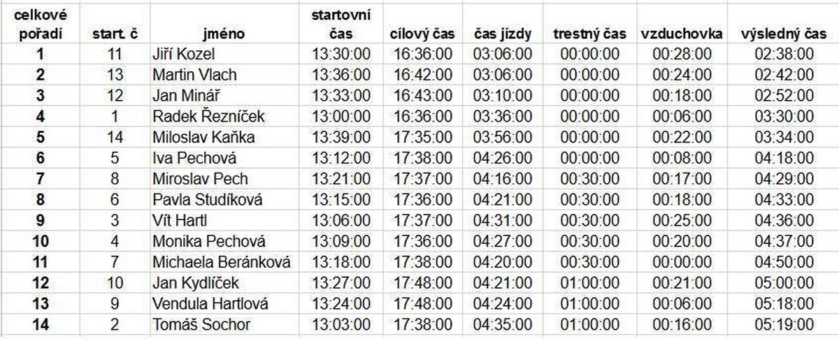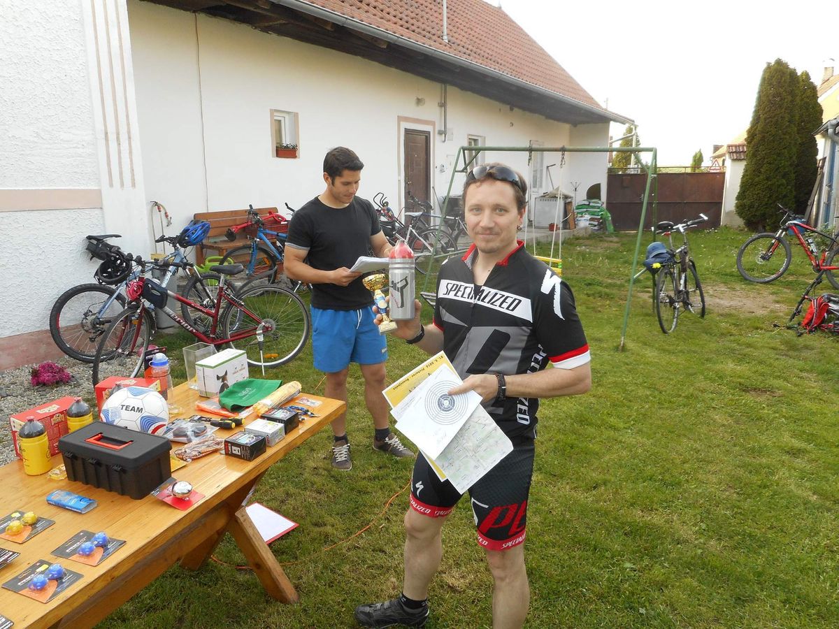 Za krásného počasí jsme dnes uspořádali 3. ročník orientačního cyklozávodu. I když se nám na poslední chvíli hodně závodníků odhlásilo, i tak se sjelo letos 14 těch, kteří měli chuť si zajet na kole okruh cca 55km, doplněný kvízem v jednotlivých průjezdních bodech. Všichni dostali ve svém času startu mapu a 13 průjezdních bodů (vesnic) na přeskáčku. Na každém tak bylo, kudy si svou cestu určí. Trasa se jim tak mohla zkrátit, ale také značně prodloužit. V každém z průjezdních bodů musel každý odpovědět na zadanou otázku, vztahující se přímo k průjezdnímu bodu. Za nesplnění, nebo nesprávnou odpověď byla penalizace 30min. Po příjezdu do cíle následovala střelba ze vzduchovky. Každý měl 3 pokusy a tolik kolik si každý vystřelil bodů, tolik se mu odečetlo z výsledného času. Závod to tedy nebyl jen o rychlosti. Všichni se závodu zhostili na výbornou. Nebylo ani tak důležité vyhrát, ale vše si s úsměvem užít. I tak byl ale souboj dvou prvních velmi napínavý, protože oba dva měli shodný čas jízdy 3h a 6min a také žádnou chybu v kvízu. Rozhodla tak vzduchovka, která přinesla prvenství místnímu Jiřímu Kozlovi. Ten nastřílel celkem 28bodů. O 4 více než druhý Martin Vlach z Tábora. Třetí místo získal Jan Minář z Přehořova. Všichni závodníci si nakonec závodu pochutnali na chutném guláši a také si každý odnesl pěknou cenu. Pochvalu a uznání si zaslouží všichni zúčastnění bez ohledu na pořadí.