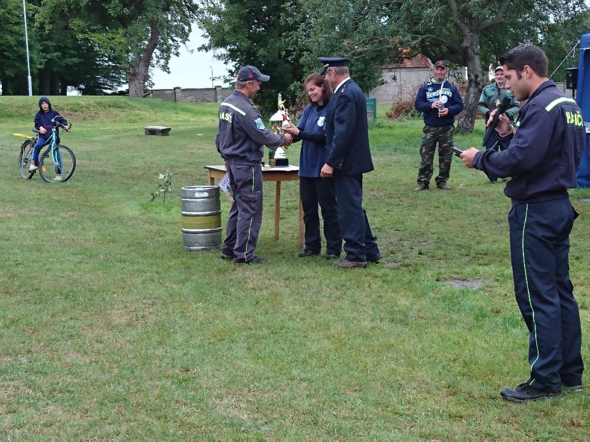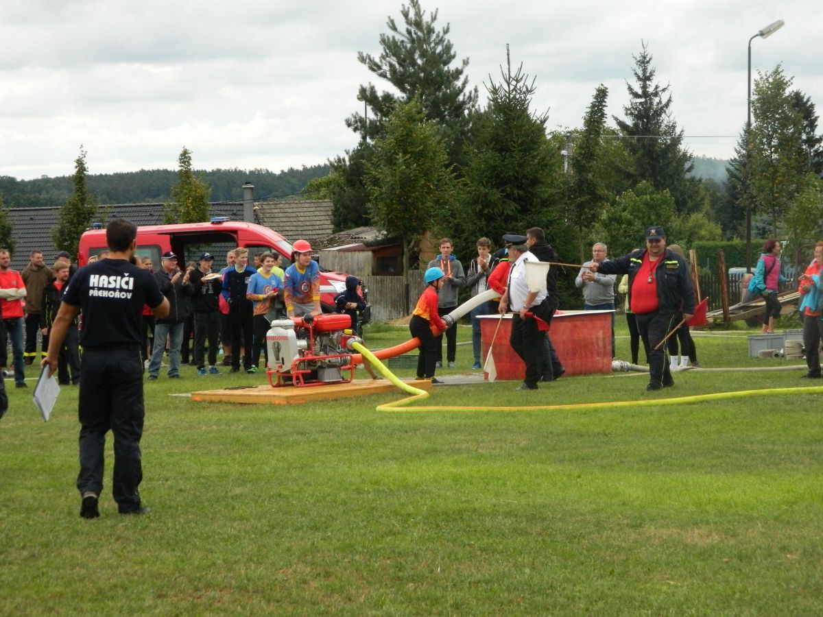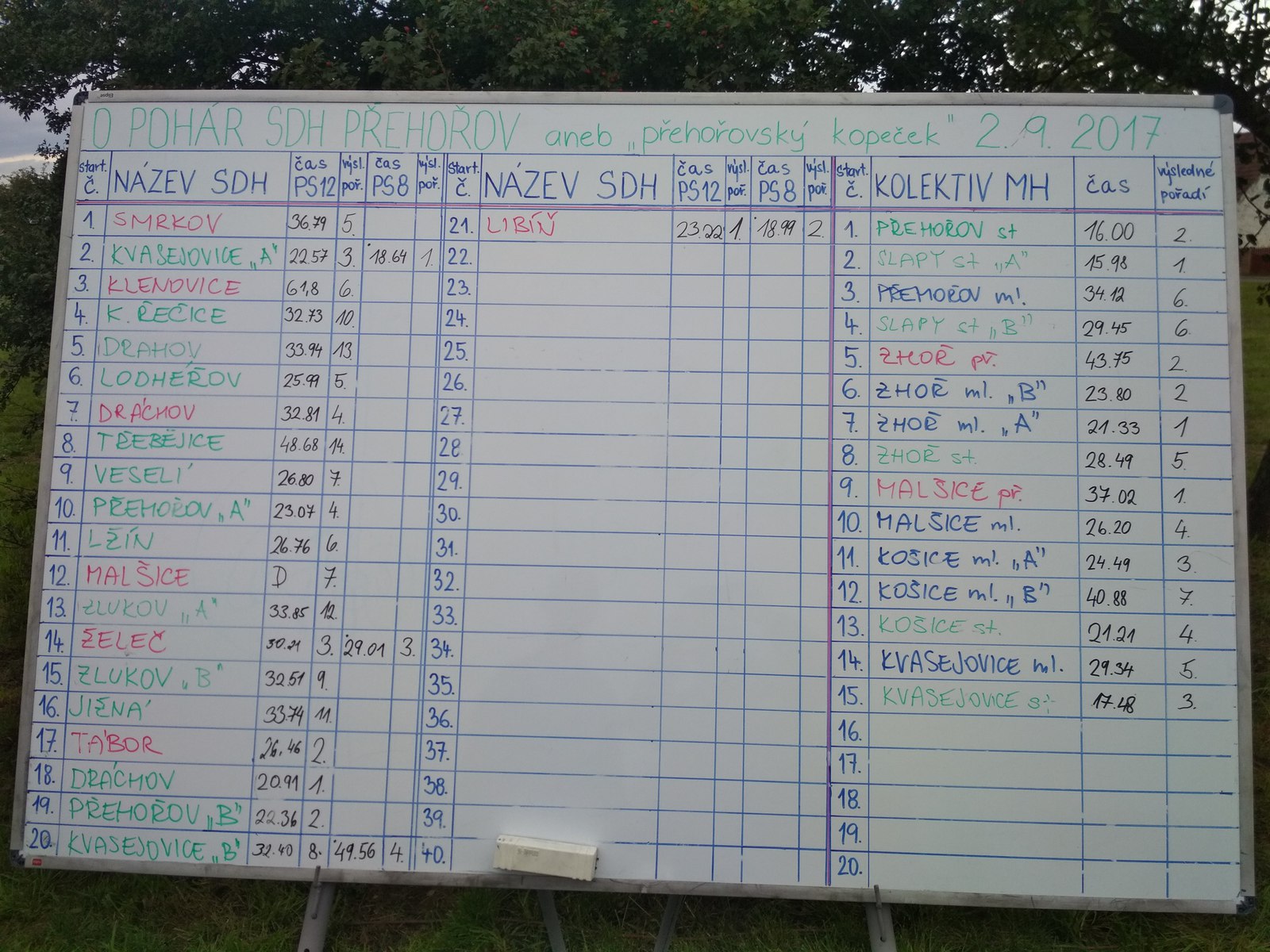 Po roce se na domácím hřišti konal již 9. ročník soutěže O pohár SDH Přehořov aneb „přehořovský kopeček“. Chladné a deštivé počasí předchozích dní se trochu zlepšilo a tak se naštěstí naše obavy o zrušení soutěže nenaplnily. Díky nízkým teplotám několik družstev svou účast odhlásilo, ale i tak se k nám sjelo celkem 36 družstev. Startovalo se opět na dvou základnách. Na jedné dospělý a na druhé děti. Dětských družstev se zúčastnilo patnáct. Pro nás to byla premiéra hlavně v kategorii mladší, kde poprvé běžely soutěž naše děti. Ty nakonec za velkého potlesku diváků zaběhly čas 34,12s a umístily se na 6. místě ze sedmi týmů. Pro ně to byla první velká zkušenost na takovéto soutěži. V kategorii starších se našemu družstvu podařilo zaběhnout dosavadní nejlepší čas s naší stříkačkou PS12 a to 16:00s a byly blízko vítězství. Tento čas o pouhé dvě setiny však předčilo družstvo Slapy „A“ a časem 15,98s vyhrálo. Našim starším dětem zůstalo z domácí soutěže nádherné 2. Místo (z celkem šesti družstev) a potvrdili svou dosavadní kvalitu. Za nimi časem 17,48s získaly bronz Kvasejovice. Poslední závod v dětské kategorii to byl pro naši Báru Kozlů, která se tak s dětským družstvem rozloučila výtečně – na domácí půdě a ještě ziskem medaile. V tuto chvíli byla soutěž přerušena a dětem byly předány ceny a medaile. Mezi dospělými se také dařilo. Družstvo B dosáhlo časem 22,36s na nádherné 2. místo. Družstvo A pak časem 23,07s na místo čtvrté. Mezi domácí se na třetí příčku časem 22,57s dostali také partnerské Kvasejovice. Mužských družstev bylo celkem čtrnáct. Za obě dospělá družstva si svou premiéru mezi dospělými odbyl Vláďa Petržilka – oba útoky zvládl na proudu výborně. Prvenství si odvezli tentokrát hasiči z Dráchova díky času 20,91s. Získali tak mimo putovní pohár také sud piva. Naše ženy tento závod neběžely. Zde zvítězilo ze sedmi přihlášených družstvo Libíň časem 23,22s. V kategorii PS8, kde se běželo na dětské dráze na dětské hadice ženy i muži dohromady, jsme domácí družstvo neměli. Z celkem čtyř přihlášených se nejlépe dařilo družstvu z Kvasejovic, kteří vyhráli s časem 18,64s. Všechny ostatní výsledky jsou přiloženy ve fotogalerii. Po vyhlášení výsledků následovala pivní štafeta se třemi pivy. V mužích zvítězil Lžín (pouze ve dvou) časem 14,32s. V ženách pak Dráchov časem 16,83s. Na dodržování pravidel letos dohlížel jako hlavní rozhodčí p. Šustr, na koších náš starosta J. Mendl, u dětí veselský S. Kaisler a na čárách stříkání náš O. Šimek. Obě časomíry byly letos poprvé elektronické – u dospělých SDH Želeč a u dětí HZS Tábor. Devátý přehořovský kopeček v pořadí tak dopadl i přes chladné počasí super a dle ohlasů družstev se zde divákům i sportovcům opět líbilo, a zato jsme moc rádi.