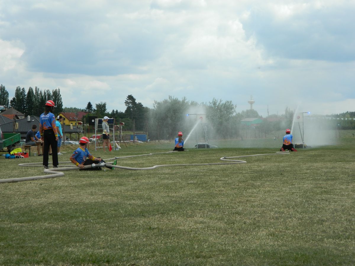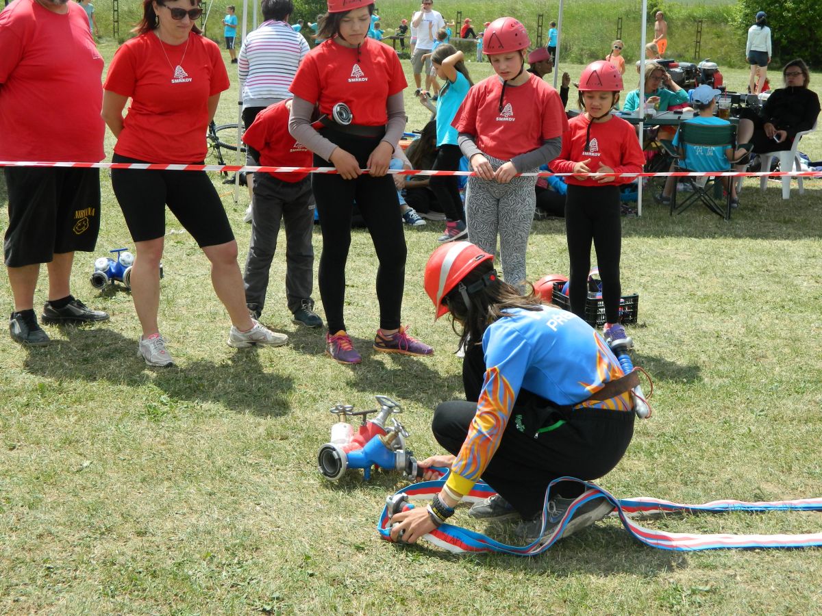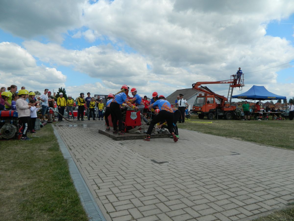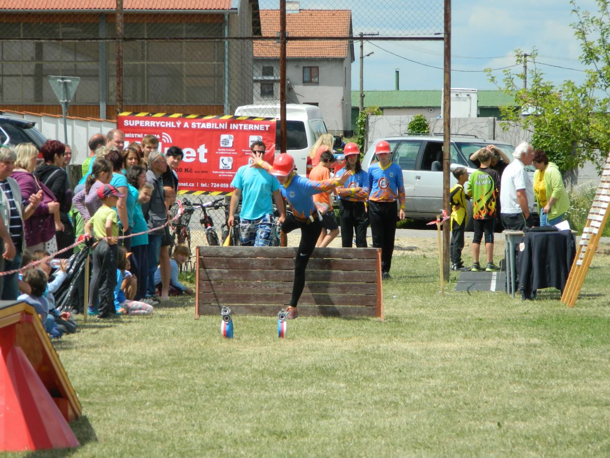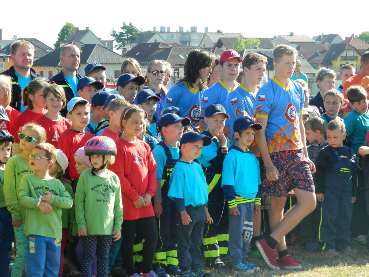 Po předchozím náročném dnu a dvou soutěžích nás hned ráno čekala další soutěž a to dětská ve Slapech. Sem se do horkého počasí sjelo 41 družstev. Požární útok se dětem tentokráte povedl dokončit s časem 17,69s a bylo z toho krásné 3. místo z třinácti v kategorii. Tři děti si také zaběhly doplňkovou soutěž v běhu na 60m s překážkami. Tady se bohužel v rozběhu na bariéře zranila naše B. Kozlová a pokus nedokončila (naštěstí vše dobře dopadlo a večer již byla v pořádku). Svůj pokus dokončil F. Koranda a V. Petržilka - na medailové pozice to však tentokráte nebylo.