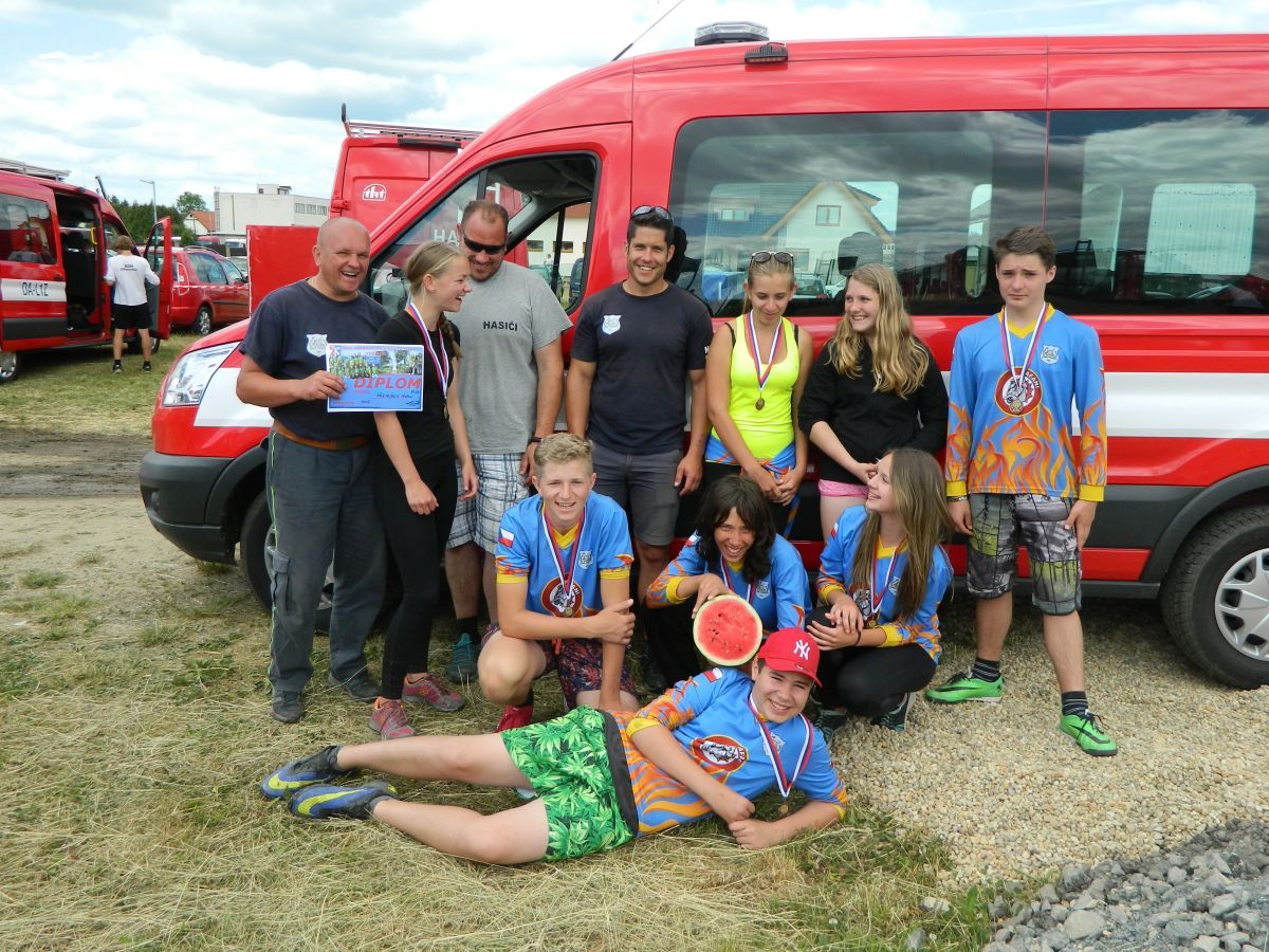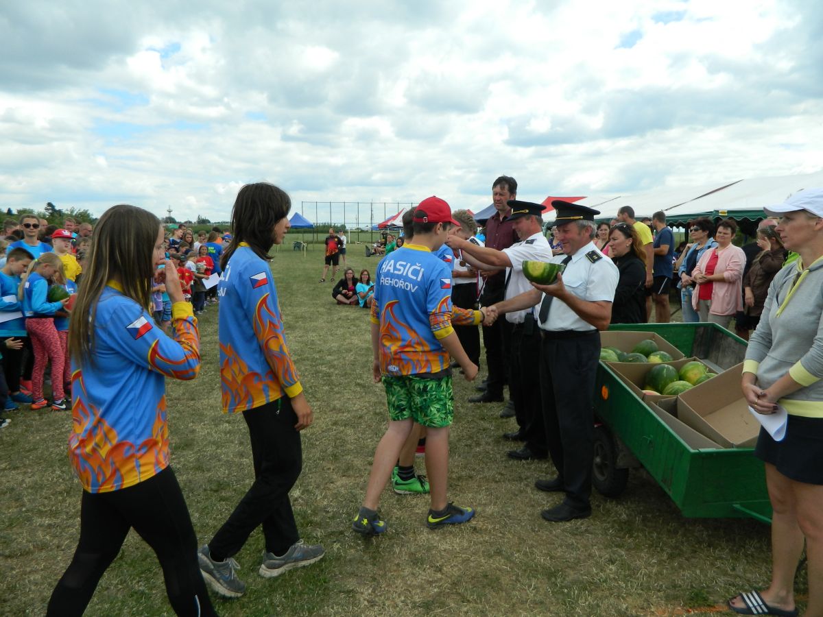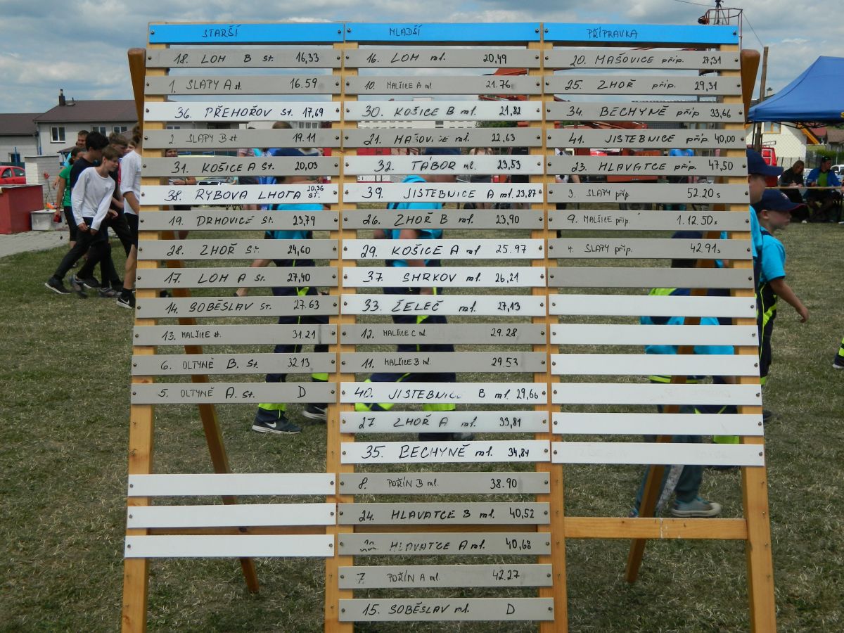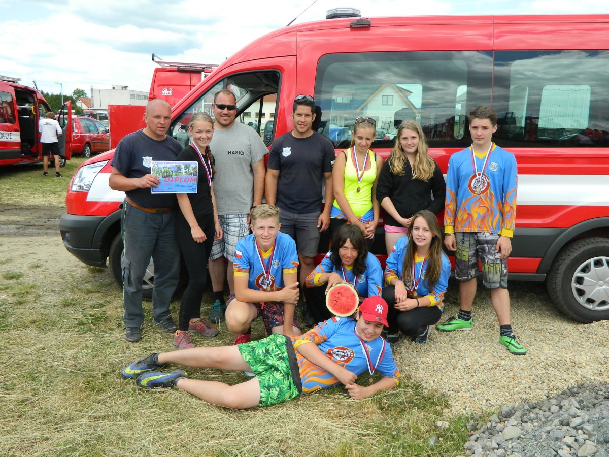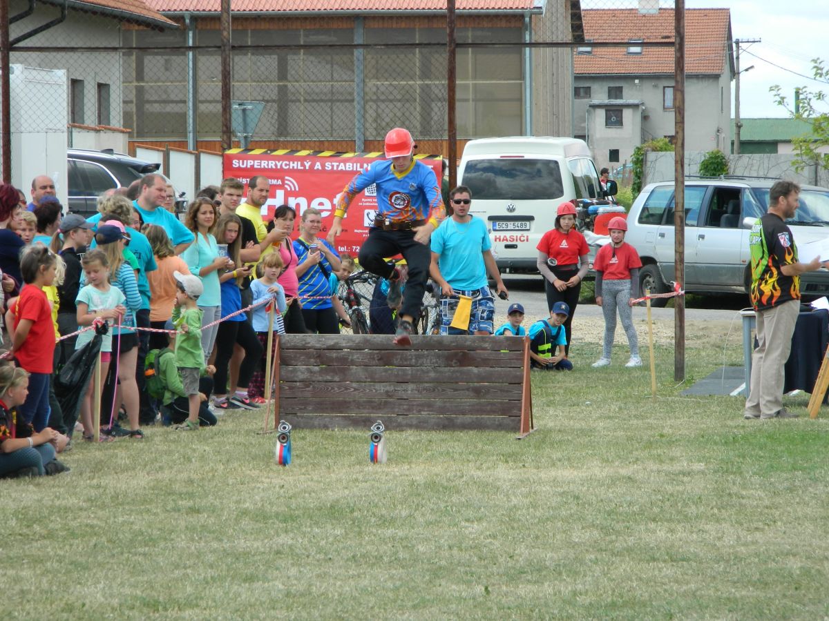 Po předchozím náročném dnu a dvou soutěžích nás hned ráno čekala další soutěž a to dětská ve Slapech. Sem se do horkého počasí sjelo 41 družstev. Požární útok se dětem tentokráte povedl dokončit s časem 17,69s a bylo z toho krásné 3. místo z třinácti v kategorii. Tři děti si také zaběhly doplňkovou soutěž v běhu na 60m s překážkami. Tady se bohužel v rozběhu na bariéře zranila naše B. Kozlová a pokus nedokončila (naštěstí vše dobře dopadlo a večer již byla v pořádku). Svůj pokus dokončil F. Koranda a V. Petržilka - na medailové pozice to však tentokráte nebylo.