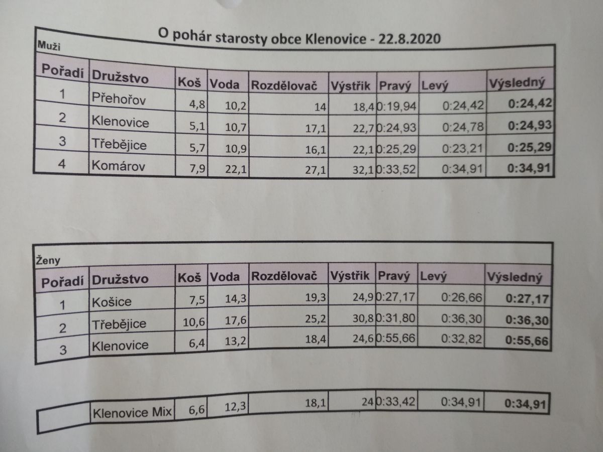 Na čtvrtou letošní soutěž jsme vyrazili do Klenovic s mužským družstvem. Sjela se zde čtyři družstva mužů a tři žen se stroji PS 12 na 2B. Nám se tentokrát povedl fantastický rozběh, kdy první proud „sestřelil“ v čase 19,94s. Pokroucená hadice C na druhém však dostala výsledný čas na 24,42s. I tento čas se ale nepovedlo tentokrát žádnému družstvu překonat a tak jsme se mohli radovat z obhajoby prvního místa z loňského roku. Mimo ocenění za družstvo si odnesl z týmu nejlepší proudař - Jan Marko, nejlepší košař - David Votápek a nejlepší rozdělovač - Jiří Kozel. Mimo krásné poháry jsme získali malý soudek piva a drobné ceny. Naše účast v pivní štafetě, kdy se k pivu skákalo v pytli, byla bez úspěchu, avšak radosti nadělala mnoho. Jedním z rozhodčích byl dnes náš starosta Jaromír Mendl.