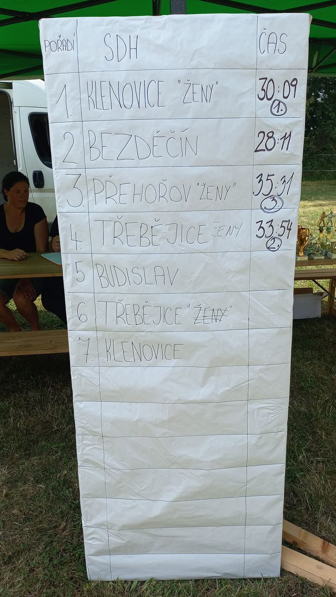 Na sobotní odpoledne připravili klenovičtí hasičskou soutěž. U nás byla celkem složitá situace s účastí kvůli přípravám na dnešní festival a stále také nemáme opravenou stříkačku. Nakonec chlapi zůstali na parketě připravovat festival a do Klenovic vyrazily alespoň naše holky. Celkem se zde sjelo 7 družstev, z nichž 3 byla ženská. Holky běžely s veškerým vybavením zapůjčeným od místních. Při jejich pokusu se nepodařilo ideálně nasadit košík. Výsledný čas 35,31s pak znamenal 3. místo. Holky si to ale přijely užít, takže se poté ještě nemohly nepřihlásit do pivní štafety. No a tady z toho nakonec bylo místo první.