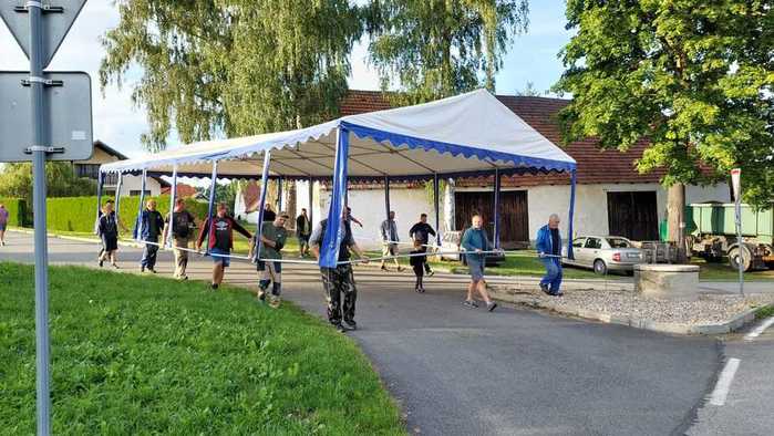 Na poslední velkou akci – traktoriádu, stavíme na dvoře hasičárny velký stan 6x12m. Ten nám zůstal po hasičské soutěži na hřišti. Jeho rozebrání a opětovné postavení zabere spoustu času a zaměstná hodně lidí. Napadla nás tedy myšlenka, že bychom stan složený přenesli. Dali jsme echo nejen hasičům, ale i ostatním z našich vsí a domluvili čas na čtvrtek 18h a zkusili tenhle nesmělý plán realizovat. Lidí se sešlo opravdu hodně a tak jsme ho prostě a jednoduše zvedli a mířili s ním na náves do Přehořova po silnici. Během toho jsme ho museli párkrát zvednout nad hlavu, aby projela auta a dokonce i motorky. Před bránou na dvůr jsme se museli zastavit a stan rozdělit na dva díly – vrata jsou totiž o cca 60cm menší než samotný stan. Nakonec se nám ho na jedné straně podařilo přenést zvednutý nade zdí a za malou chvíli už byl na svém místě. Všichni byli odměněni připraveným pivem či limonádou. Na konec z toho byla povedená akce, u které jsme zažili spoustu legrace, a nám to ušetřilo spousty práce.