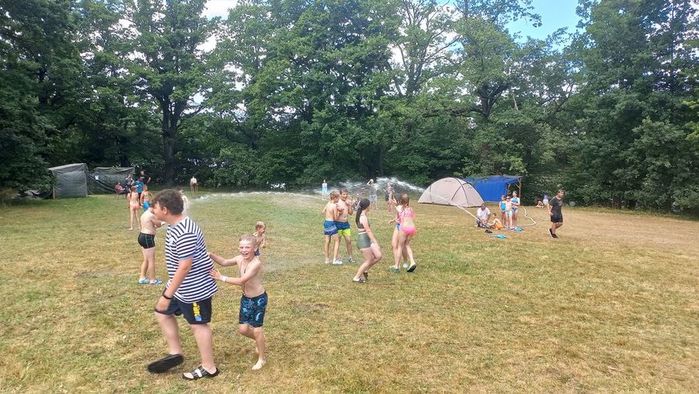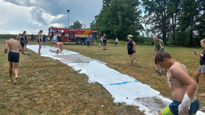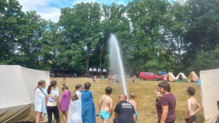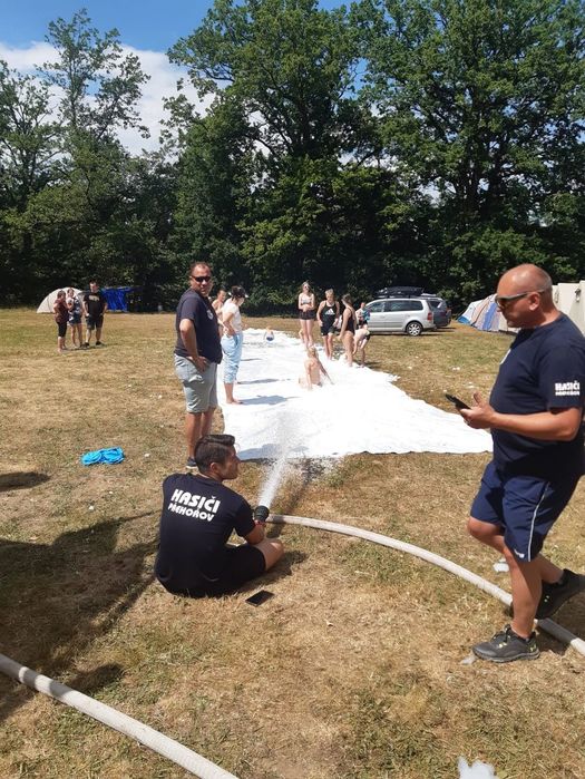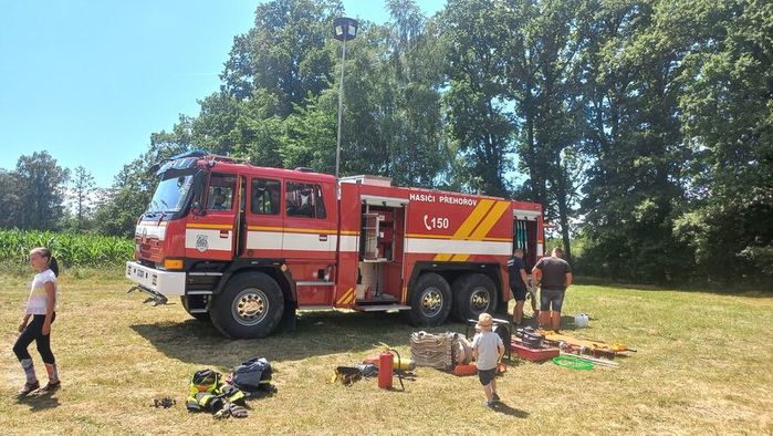 Letní dětský tábor Dírná i letos pořádal pro děti spoustu zajímavých akcí. I letos byl zájem o naše hasiče. Vyrazili jsme tedy s naší CAS 32 po obědě za dětmi. Zprva jsme je prozkoušeli z čísel tísňových volání, děti si také vyzkoušely volání na tísňovou linku, nebo jsme si ukázali jak použít hasicí přístroj. Na vlastní oči se děti přesvědčili, že rostlinné oleje na pánvičce není radno hasit vodou. Prohlédly si vybavení naší jednotky a pak si jako vždy nejvíce užily stříkání z proudnic a hřebem odpoledne se stala samozřejmě vodní skluzavka. Potom jsme ještě pomohli odstranit ulomenou větev, která vysela nad umývárnou a za zvuku hasičských majáků se vrátili zpět domů. Čekal nás totiž další sobotní program.
