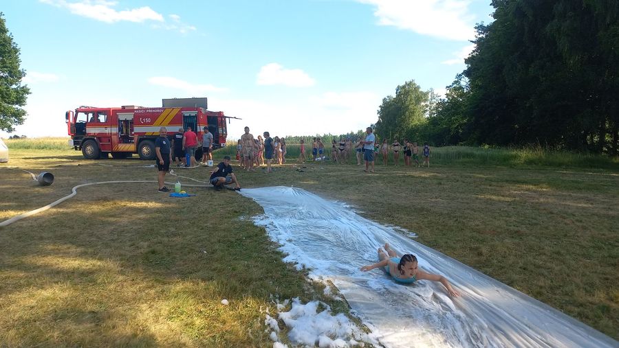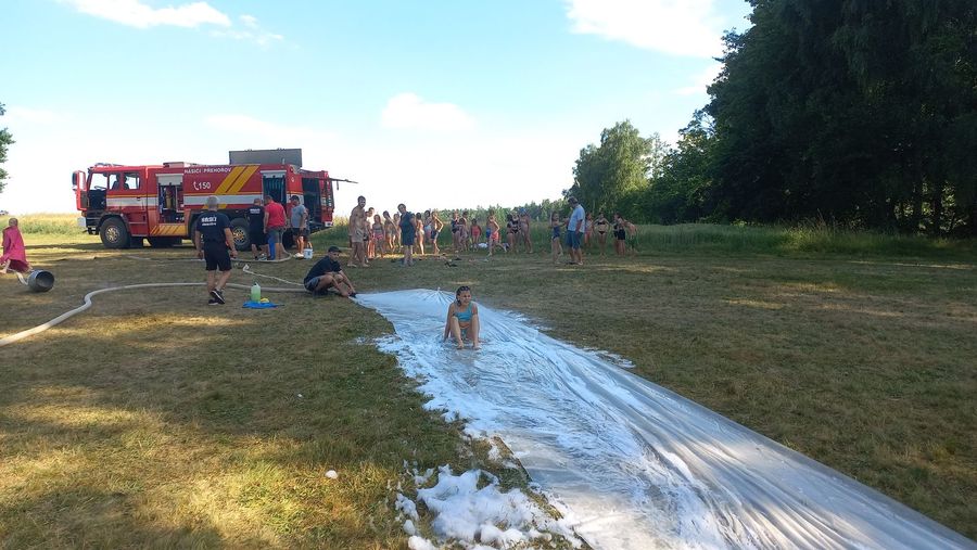 I letos jsme zavítali na letní dětský tábor do Dírné. Dětem jsme letos opět ukázali naše vozidlo, dále udělali ukázku jak nehasit olej vodou, udělali jim zábavnou pěnu a nakonec to nejlepší, na co se nejvíce těšily, byla opět vodní skluzavka.